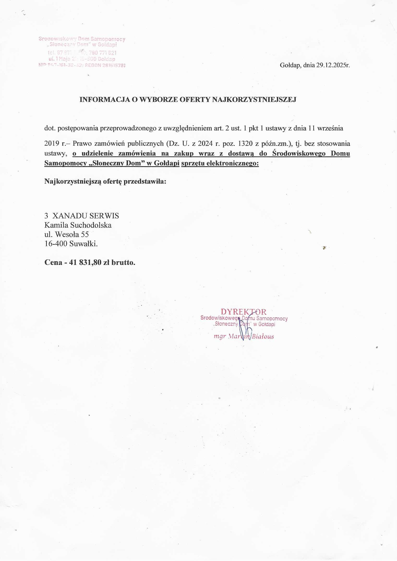 Informacja o wyborze najkorzystniejszej ofert na dostawę sprzętu elektronicznego na potrzeby ŚDS „Słoneczny Dom” w Gołdapi.